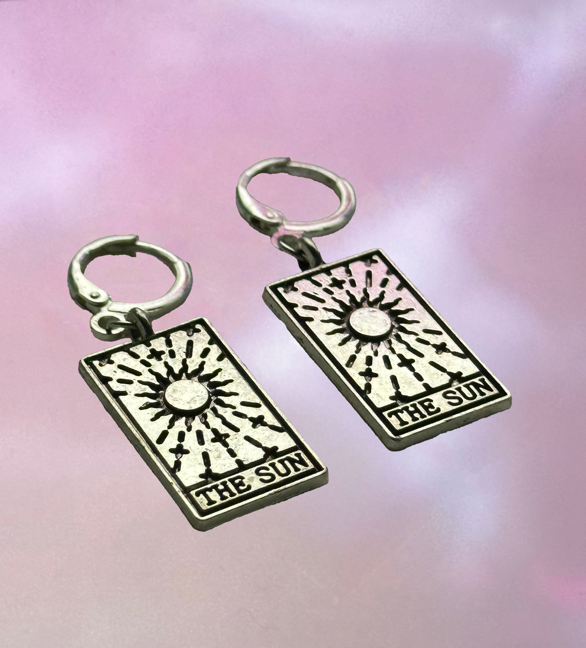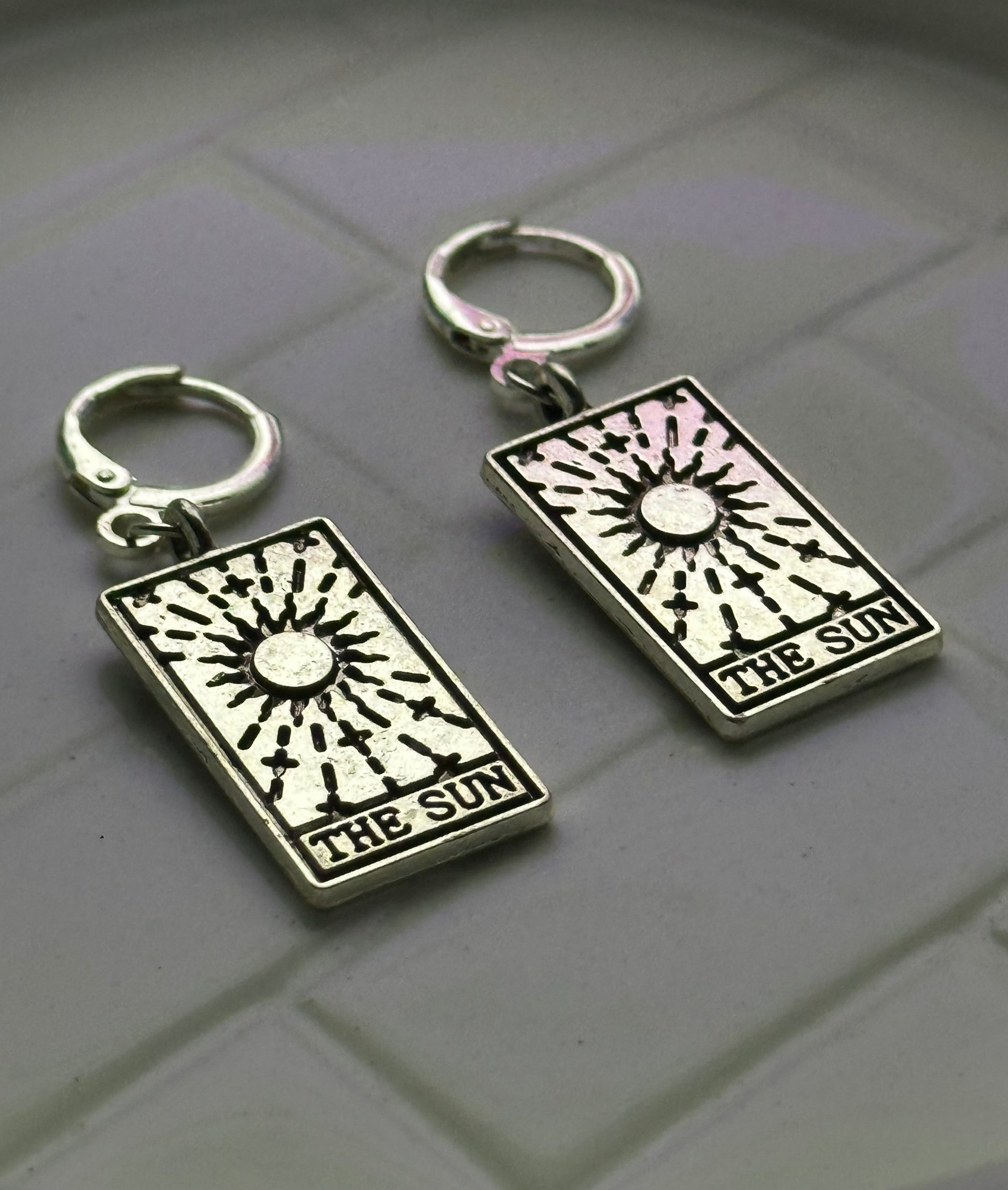 These are silver filled huggie hoop earring with stainless steel tarot card charms.Â